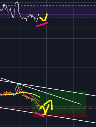 4시간봉에서 일반 상승다 이버전스가 곧 적용받을 것 같습니다. 지금구간에서 약반등 후 저점을 낮추게 된다면 채널링 하단+일반상승다이버전스로 아주 좋은 그림이 그려지고 있습니다.