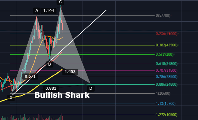 처음의 차트대로 Bullish Shark를 본다면. 24800원까지의 하락도 볼 수있습니다. 물론 하락하면서 반등은 있겠으나 본격적인 반등은 저정도 하락 후 발생하겠네요.