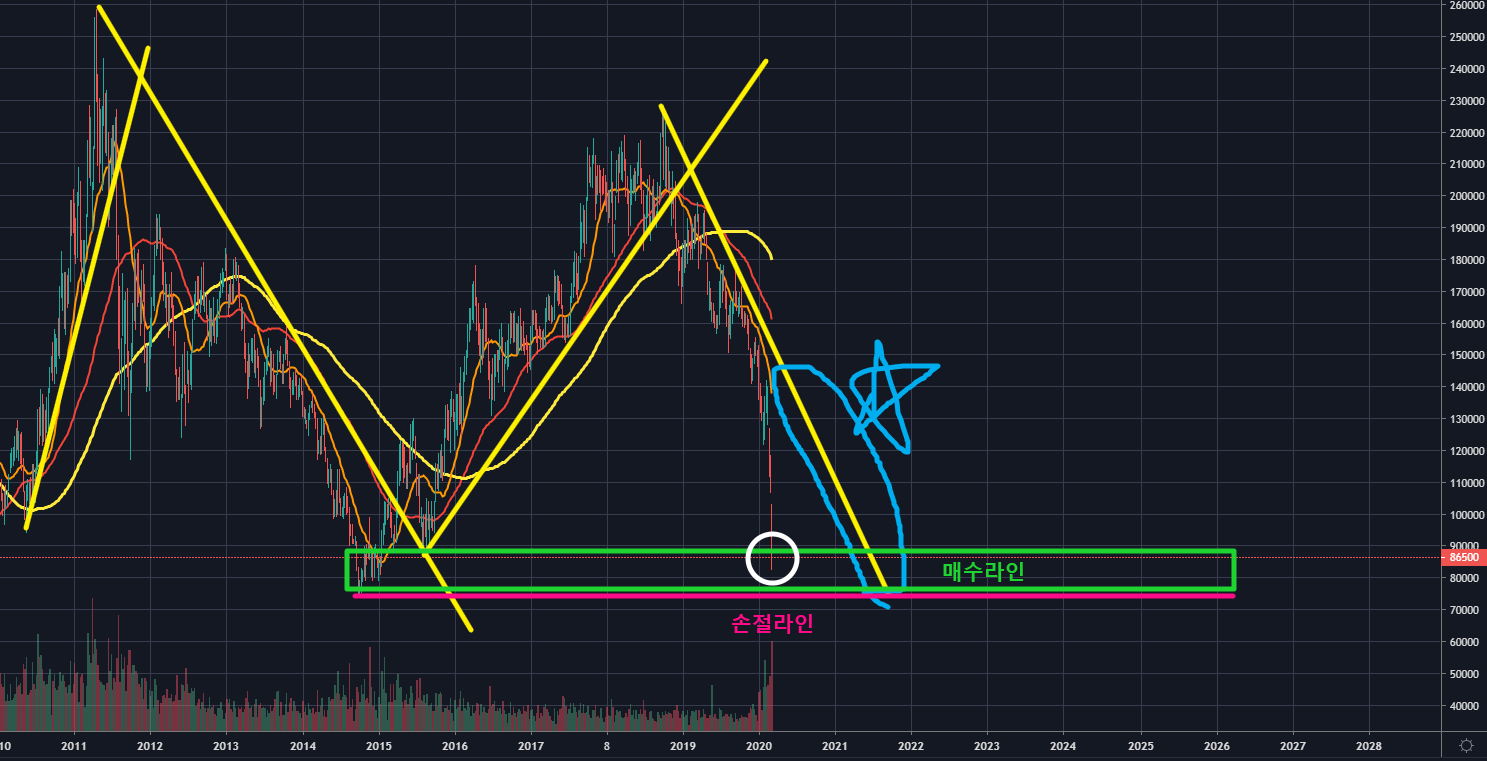 위의 주봉 차트대로 본다면, 거대한 상승추세선을 하향돌파하여 하락, 하락추세선을 상향돌파하며 상승, 다시 하락추세선을 하향 돌파하며 하락해오고 있습니다. 그렇지만 지금 자리는 하락추세선과 맞다으며 하락하고 있으며, 저 파란색으로 동그라미치고 별표친 부근을 주가가 돌파한다면 3년이상의 상승장이 오지 않을까싶네요.