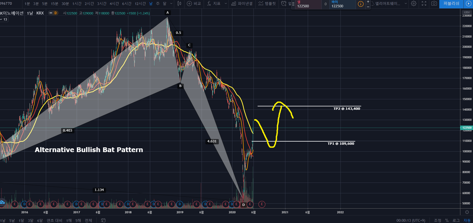 sk이노베이션은 0.886 (XA)에서 반전을 실패한 후 1.13 (XA)까지 하락하여 Alternative Bullish Bat Pattern을 완성하고 상승반전하였습니다.
