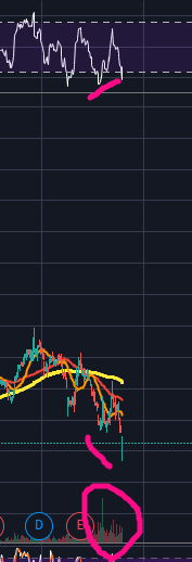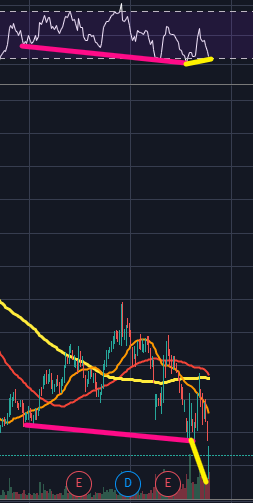 위의 일봉 차트를 보면, RSI 일반 상승다이버전스가 임박해보입니다. 반등 후 저점을 낮춘다면 컨펌이 되겠네요.