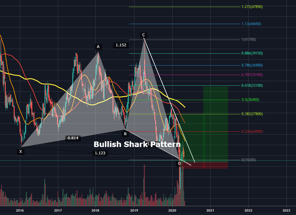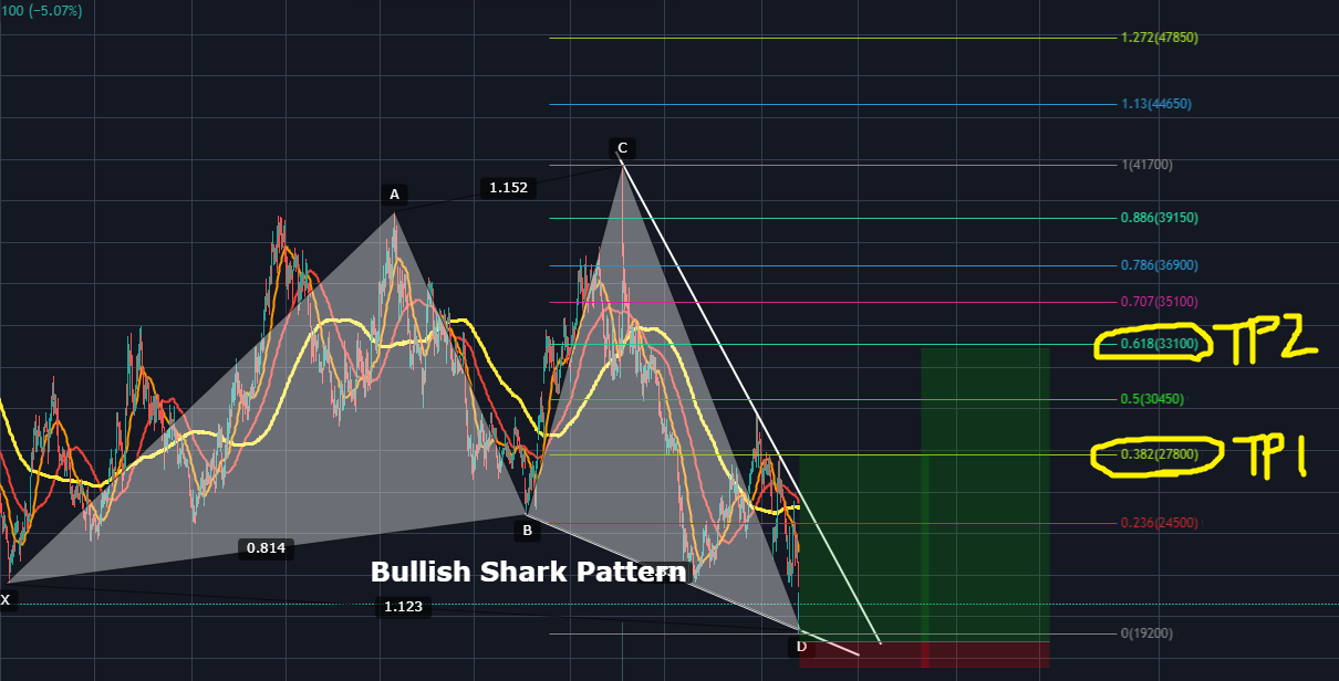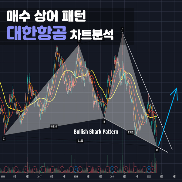 위의 차트를 보면, 대한항공은 Bullish Shark Pattern(매수 상어 패턴)의 1.13(XA)의 PRZ를 테스트한 상태입니다.