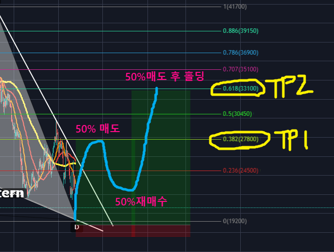 대한항공 주가가 만약 현재구간 부근에서 상승한다면 Bullish Shark Pattern(매수 상어 패턴)의 TP인 피보나치 0.382(27,800원)에서 물량의 50% 1차 익절한 후, 조정을 하게되면 2만4천원 이하에서 판만큼 다시 사서 TP2인 피보나치 0.6(33,100원)에 50%를 익절하고 나머지 물량을 TP1이었던 곳에 스탑로스를 걸고 수익을 극대화하는 것이 좋아보이네요.