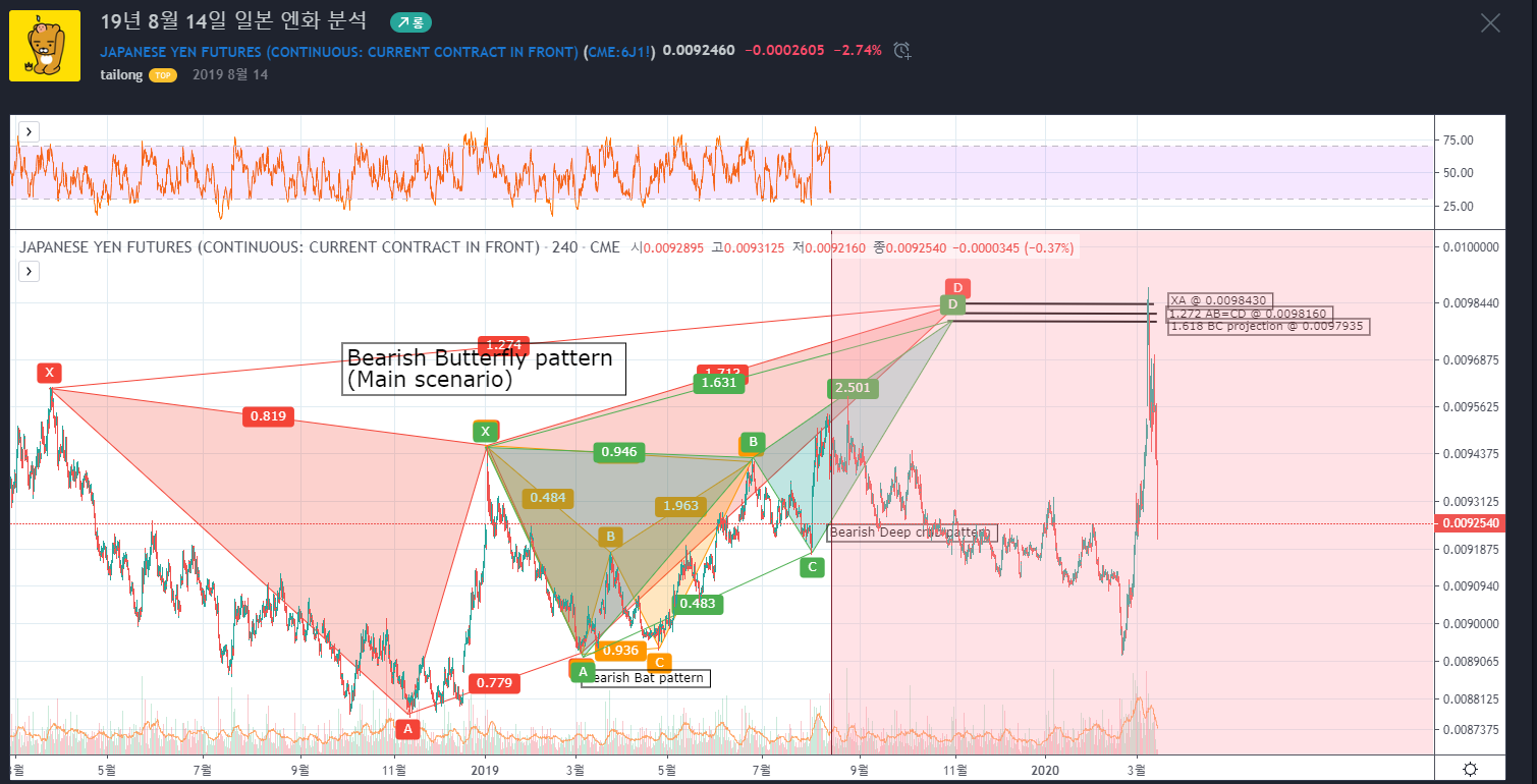 또한 제가 19년 8월 기준으로 엔화를 분석하였을 때도, 그때 당시의 차트패턴으로 Bearish Butterfly Pattern(매도 나비 패턴)과 Bearish Bat Pattern(매도 박쥐 패턴)의 PRZ를 현재 고점자리로 인식해서 올린 기록이 있네요. 해당 구간은 어떻게 보나 저항이 강했던 구간으로 보입니다.