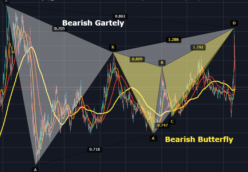 또한 가틀리 패턴의 우측 날개를 보면 아래와 같이 노란색으로 칠한 Bearish Butterfly Pattern(매도 나비 패턴)의 PRZ도 테스트 하고 저항맞은 것으로 보이네요.