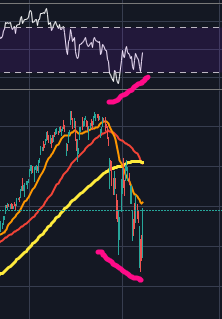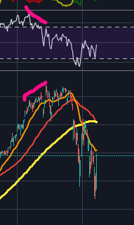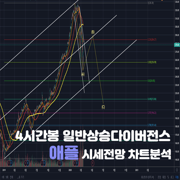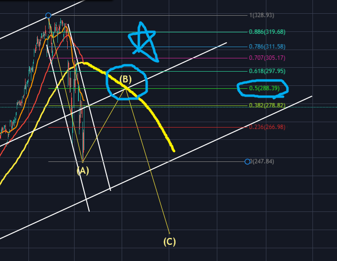 위의 차트를 보면 동그라미치고 별표친곳이 피보나치 0.5, 120이평, 채널링 중심선으로 딱 저항맞기 좋은 위치인 것을 확인할 수 있습니다. 아미 B파에서는 4시간봉 혹은 1시간봉에서 RSI가 과매수상태가 되면서 이전 328달러의 고점과 연결되며 히든하락다이버전스가 생성되고, 이후 일반 하락다이버전스가 연달아 나오면서 C파 임펄스 하락이 시작될 것 같습니다.