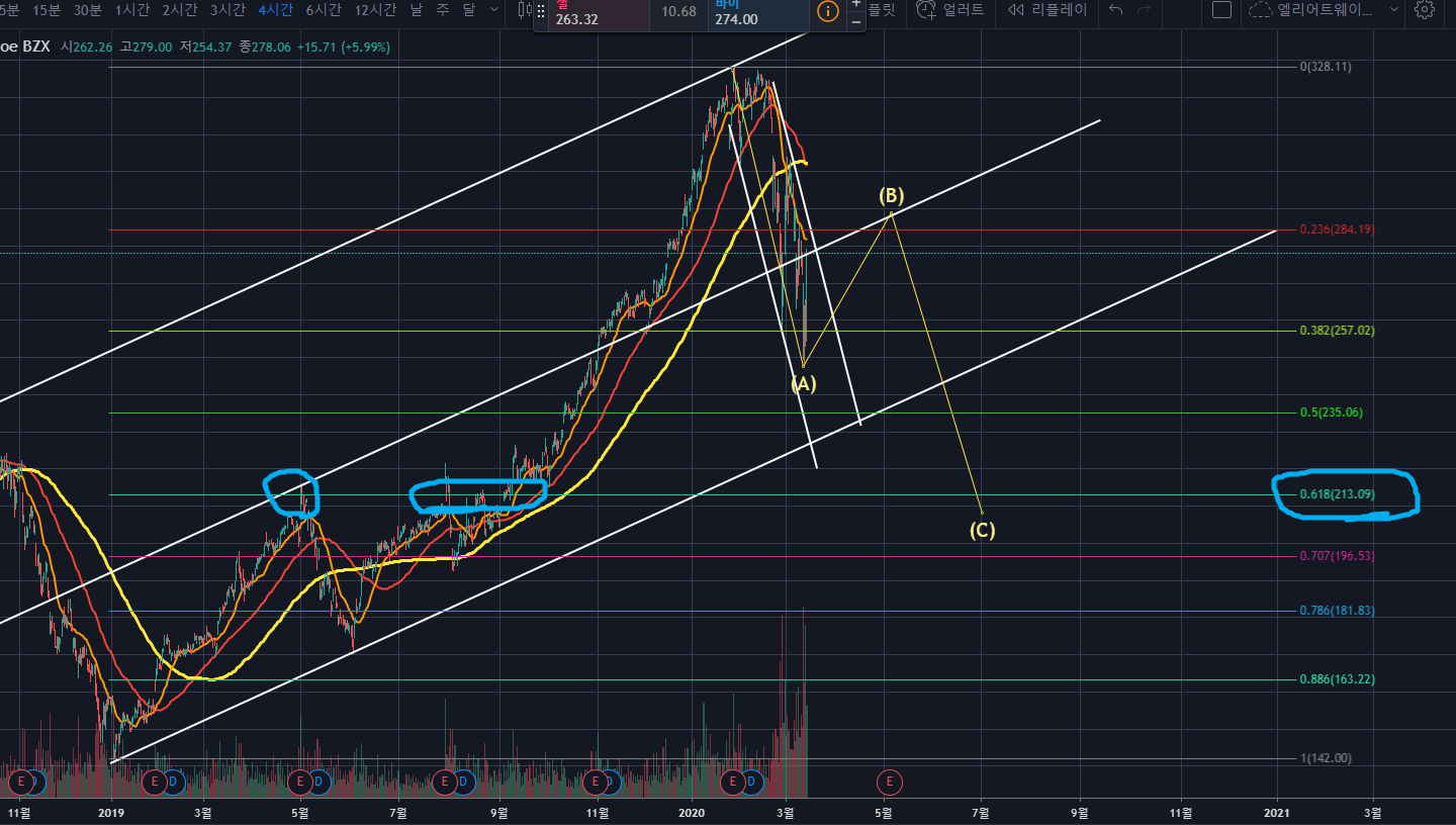 그렇기에 C파에서 상승하는 모습이 임펄스인지, ABC인지 꼭 확인하신 후 홀딩을 하는 것이 좋습니다. 반등학 된다면 250달러 부근에서는 최소한 50%를 익절매하는게 리스크관리로 좋아보이네요.