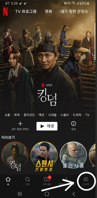 위의 사진처럼 넷플릭스 어플에서 우측 하단에 더보기를 누릅니다.