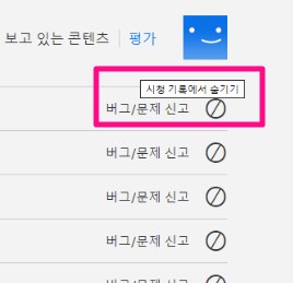 위의 시청기록에서 숨기기를 누르면, 시청기록에서 사라지게 됩니다. 한 번 눌러볼까요?