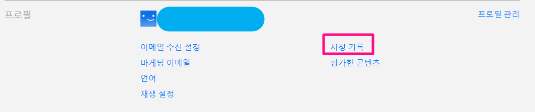 계정에 들어가면 아래쪽 프로필 구분자를 보면 빨간색 박스로 표시한 '시청 기록'이라는 것이 있습니다. 이것을 클릭합니다.