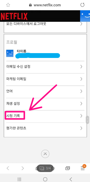 위의 빨간색 박스안에 시청기록을 클릭하면 pc버전과 같이 그동안의 시청기록이 나옵니다.