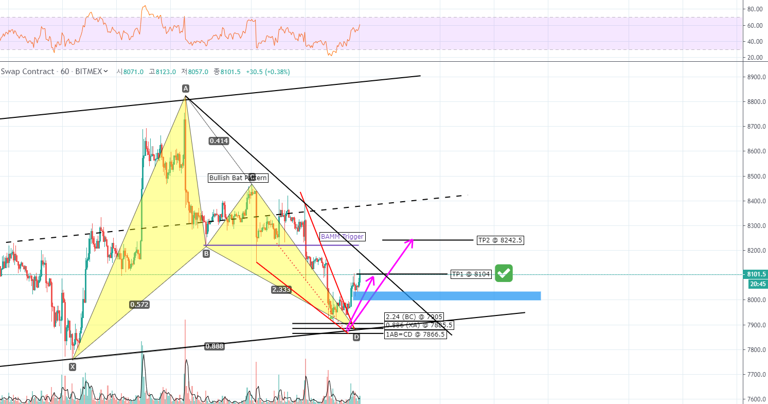 지난번 올린 분석글의 매수 박쥐 패턴(Bullish Bat Pattern) PRZ를 모두 테스트하지 않았지만 반등이 나왔으며,