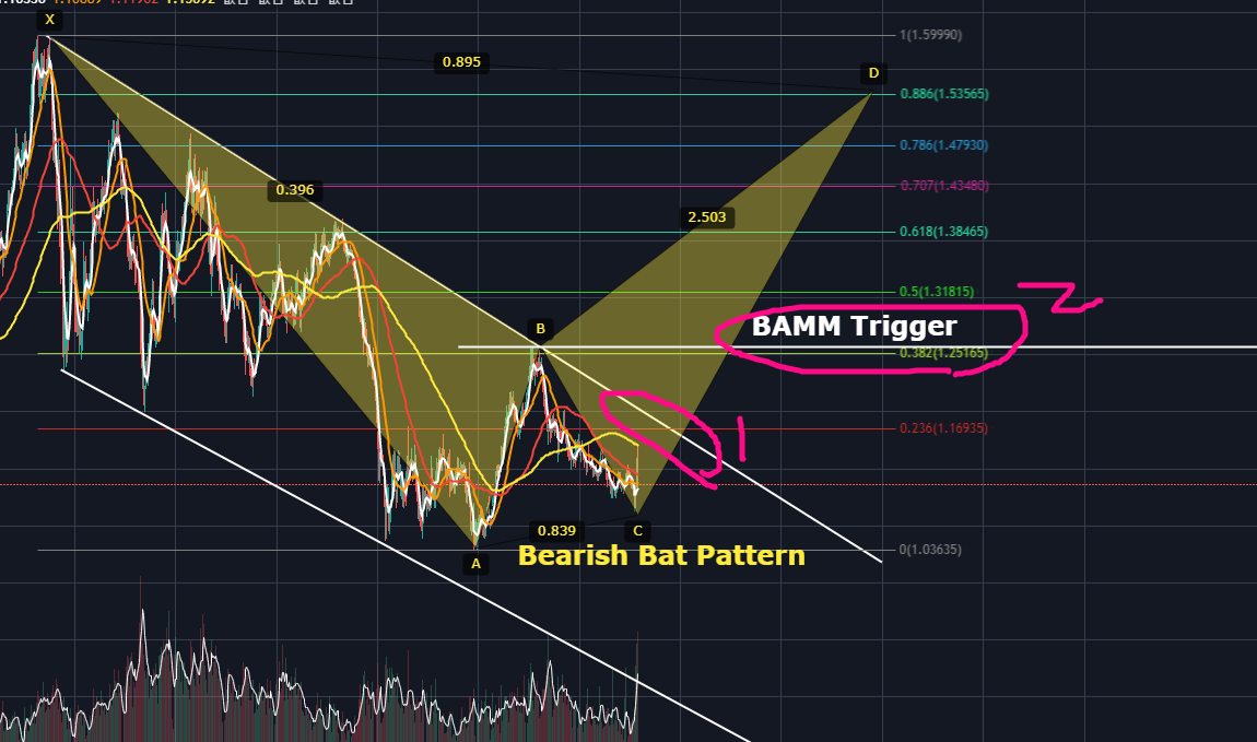 위의 그림을 보면, 1번의 하락추세선을 돌파한다면, 최소한 피보나치 0.382까지 되돌려질 것 같습니다. 그자리는 이전에 B포인트자리입니다. 이곳에서 살짝 저항을 맞은 후 상승하게된다면 하모닉패턴 BAMM Trigger가 발동되면서 Bearish Bat Pattern(매도 박쥐 패턴)의 PRZ까지도 도달할 수 있어 보입니다.