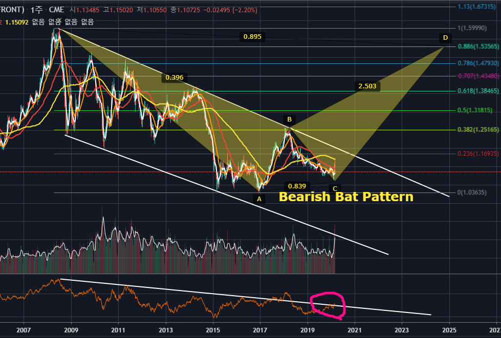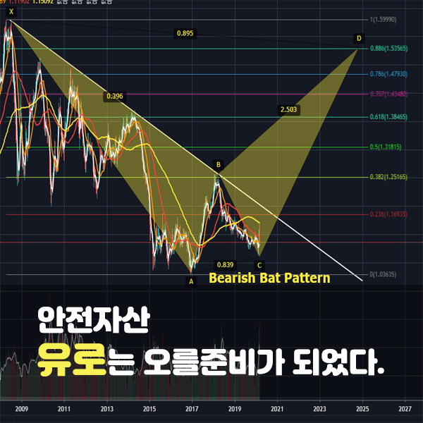 저는 지금자리에서 유로화는 매수가 좋아보이며, 하락추세선을 돌파한다면 추가매수한 후에 0.382부근에서 절반을 판 후, 다시 조정으로 내려온다면 판만큼 추가매수한다음에 피보나치 0.886자리에서 모두 청산을 목표로 매매할 생각입니다. 0.886 (XA)에서 Bearish Bat Pattern이 나온다면 숏진입을 하면 좋을 것 같네요.