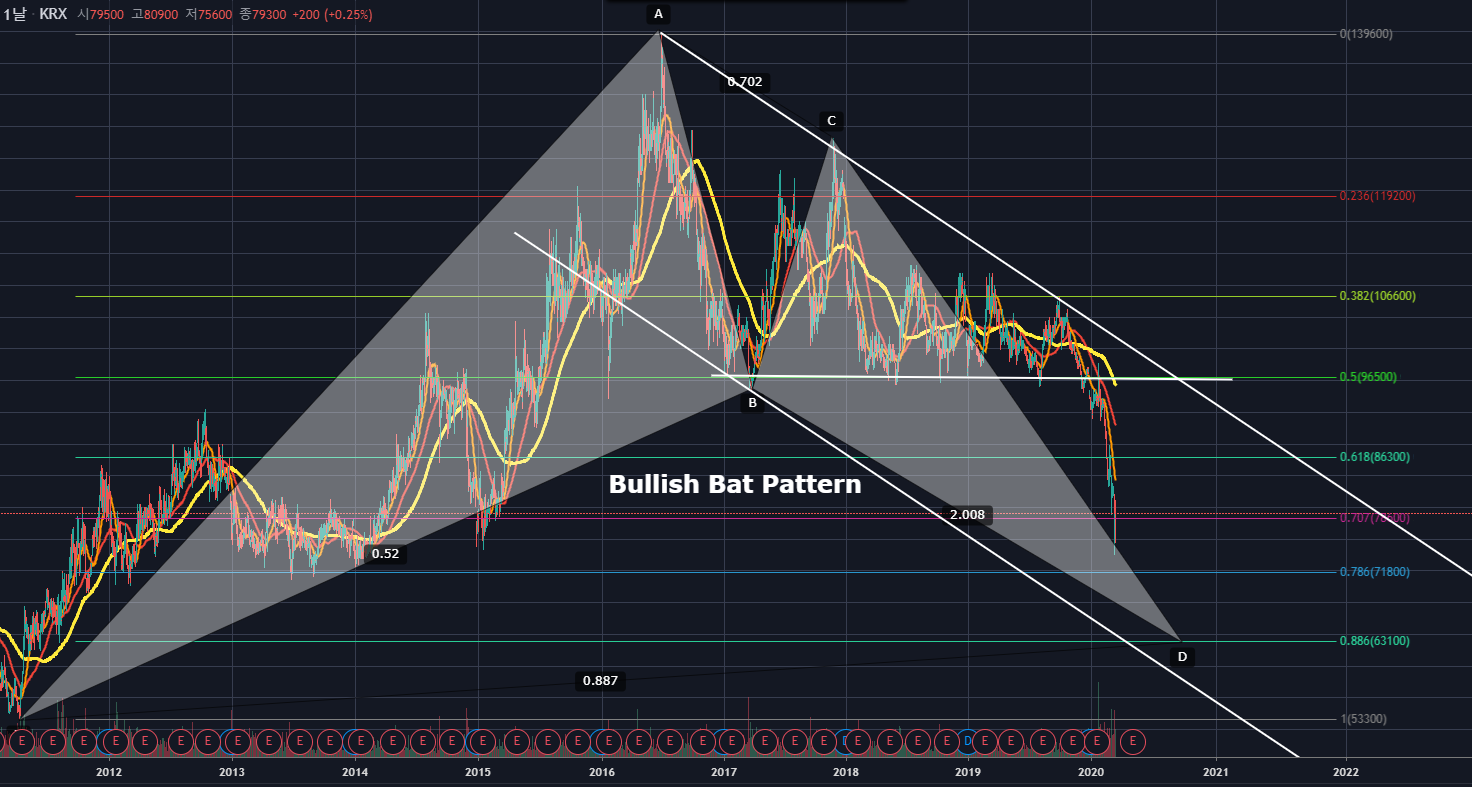 위의 그림대로 케이티엔지 1일봉에 Bullish Bat Pattern(매수 박쥐 패턴)이 식별되고 있습니다.