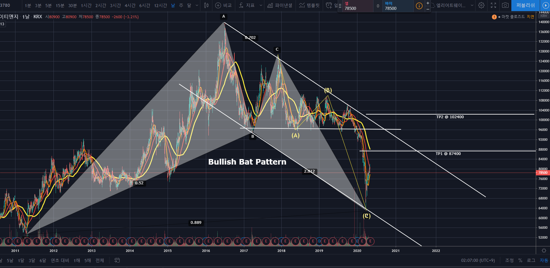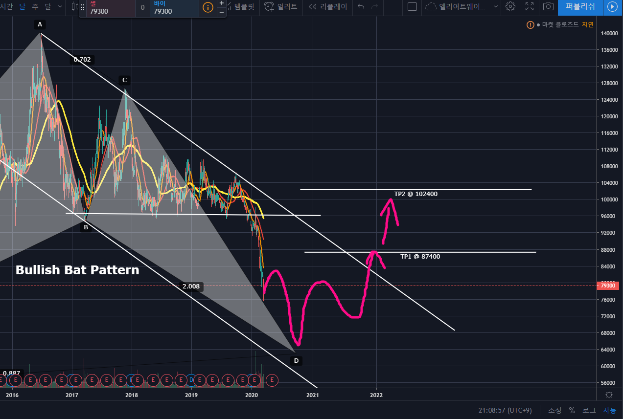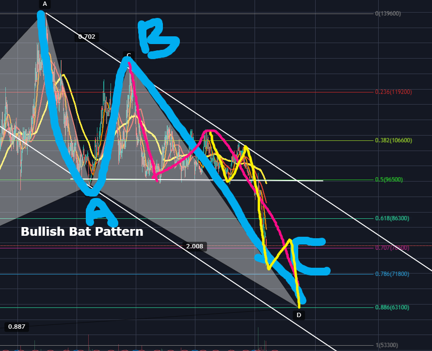그렇게 된다면 Bullish Bat Pattern(매수 박쥐 패턴)의 PRZ를 테스트 한 것이고, 상승하기 좋아보입니다.