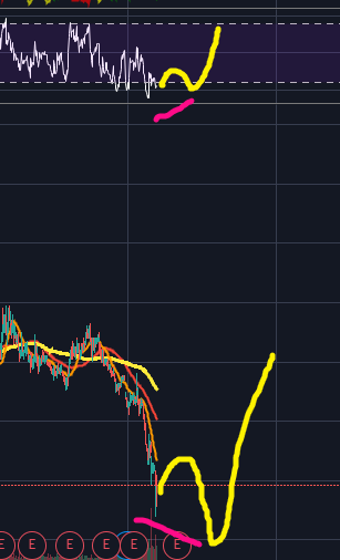 노란색 임펄스 하락 중 3파까지 진행되었으며, 4파 되돌림 후 5파가 하락하면서 0.886(XA)에서 반등이 시작될 것 같네요.