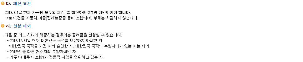 위의 재산 요건과 신청 제외 사유에 해당하는지 확인을 꼭 해주세요. 신청대상자라고 안내받았지만 신청한 후에 반려되는 경우도 있더라구요.