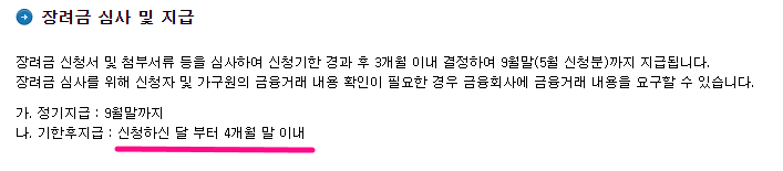 위의 내용에서 확인할 수 있듯, 정기지급은 9월말까지이며 신청한 달 부터 4개월 말 이내이므로, 9월말에 5월분이 지급됩니다. 아직 9월말까지는 6개월이나 남아서 신청자들은 기다리는데 힘들 수도 있겠네요.
