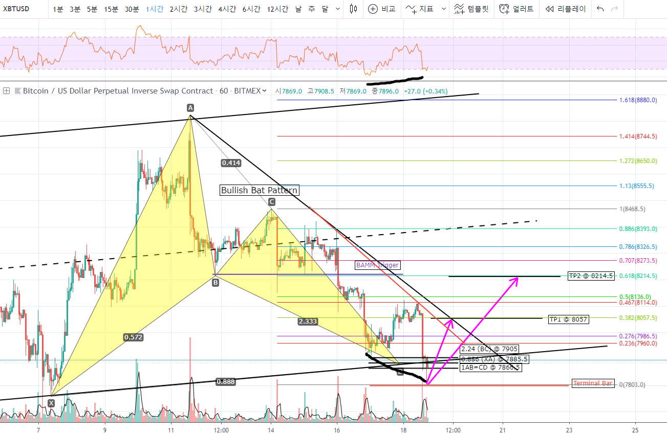 안녕하세요. 비트코인 8090k에 진입하였습니다. 금일 분석을 시작하겠습니다. 지난번 올린 분석글의 매수 박쥐 패턴(Bullish Bat Pattern) PRZ를 모두 테스트하지 않았지만 반등이 나왔으며, BC Projection을 테스..