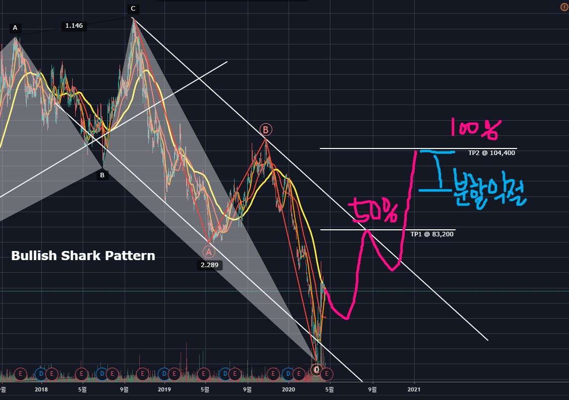위의 차트대로 Bullish Shark Pattern의 PRZ를 테스트하였으며, ABC 조정도 마무리 되었고, 일반 상승다이버전스도 생성되었기에 상승하기에 더할나위 없어 보입니다. 현재 가격에서 그대로 장대양봉을 뽑아내기 보다는, 저점과 현재 반등에서의 고점에서 피보나치 0.5정도 되돌림을 준 후 TP1인 83,200까지 상승하면서 하락채널링의 상단에서 저항을 맞을 것 같습니다. TP1인 83,200전후에서 50%의 물량을 정리하는 것이 좋아보입니다. 이곳은 좌측에서 보면 A파동이 하락하면서 지지받았던 구간이기도 하기에 저항이 예상됩니다.