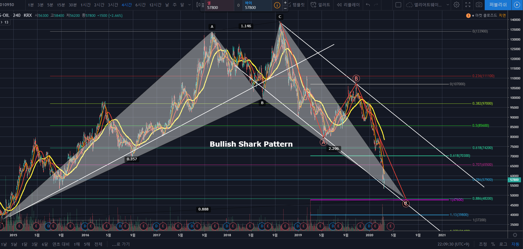 3월 17일 에스오일 주가분석에서 분석한 내용대로, 에스오일은 1번의 하락을 한 후 매수예측지점인 ABC 1:1익스텐션(분홍색) 및 0.886 (XA) PRZ 부근에서 반등한 모습을 볼 수 있습니다. 4시간 봉을 보면 RSI 일반 상승다이버전스도 Bullish Shark PRZ에서 적용되면서 추세가 상승으로 반전한 것을 볼 수 있습니다.