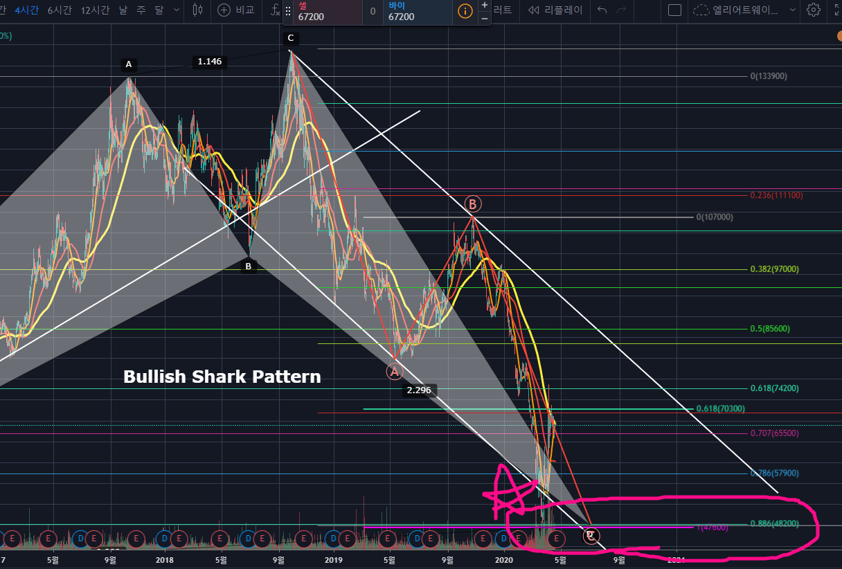 저 지점에서 Bullish Shark Pattern(매수 상어 패턴)의 PRZ반등과 ABC 조정파동의 종결, 하락채널링 하단터치, 그리고 일봉 일반 상승다이버전스가 생성되며 꽤나 큰 상승을 시작할 것 같습니다.