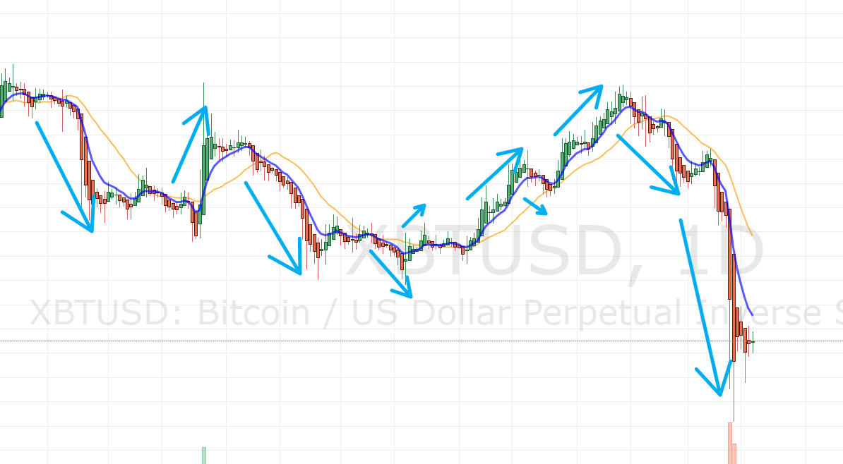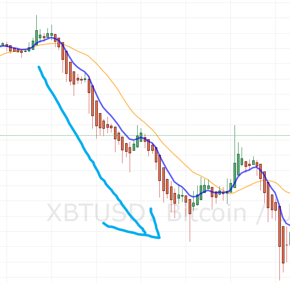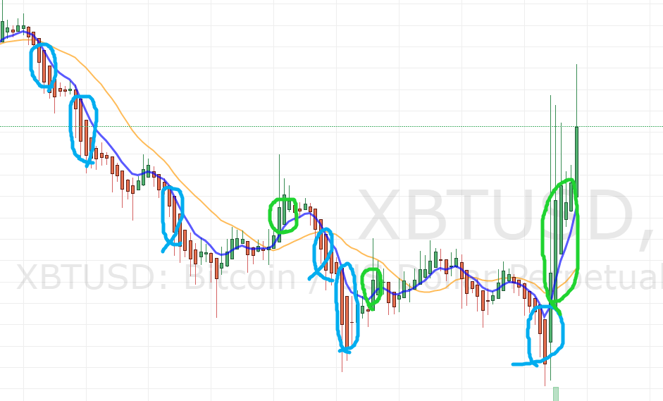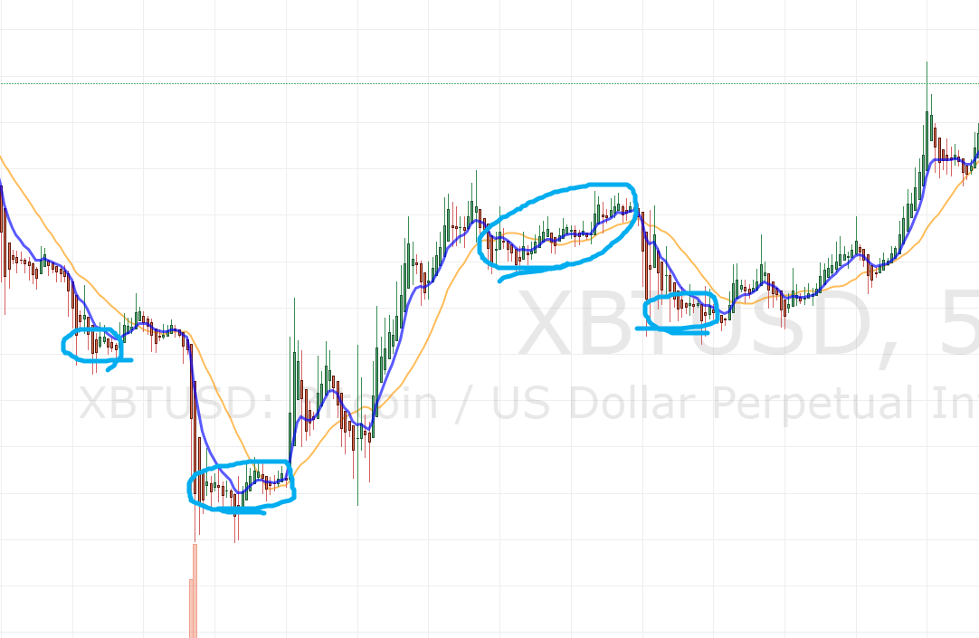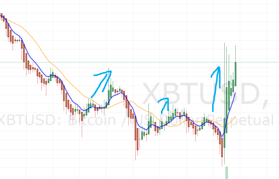 파란색은 8EMA(지수 이동평균선)이고, 주황색은 20MA(SMA, 단순 이동평균선)입니다.