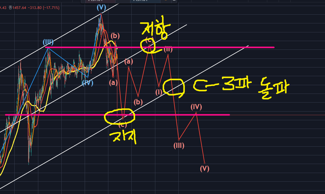 그런 후 C파 임펄스 하락을 하면서 C-3파에서 상승 채널링을 하향돌파하면서 정말 심한 급락이 나올 것 같네요.