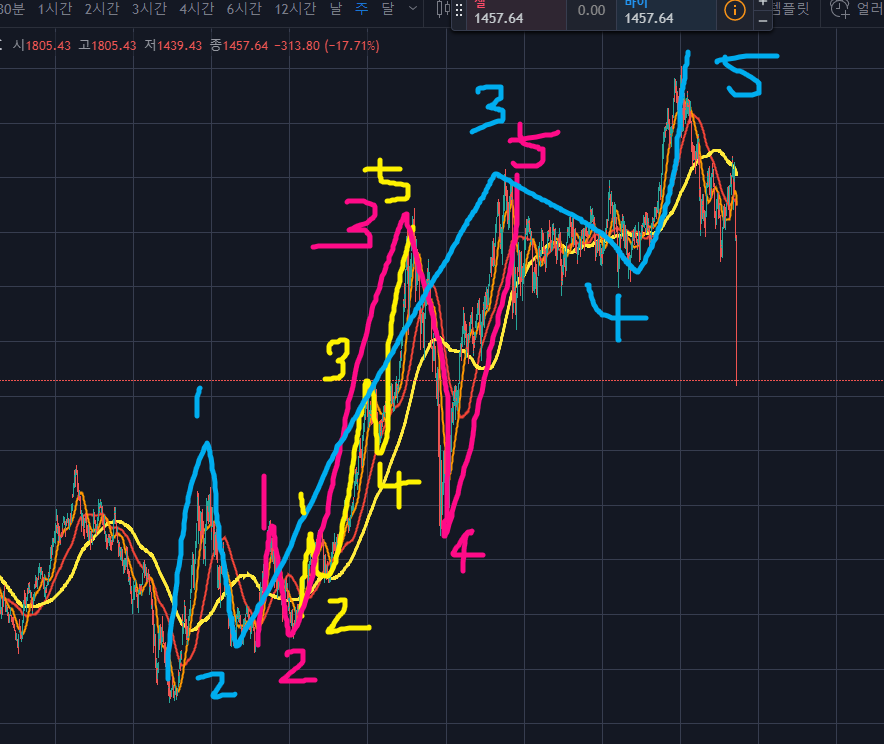 위의 그림대로 본다면 3파의 하위파동 1,4파가 약간 중첩되긴 했지만, 워낙 낙폭이 심했기 때문에 하위파동도 임펄스웨이브였다고 카운팅하였습니다.