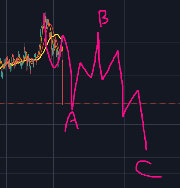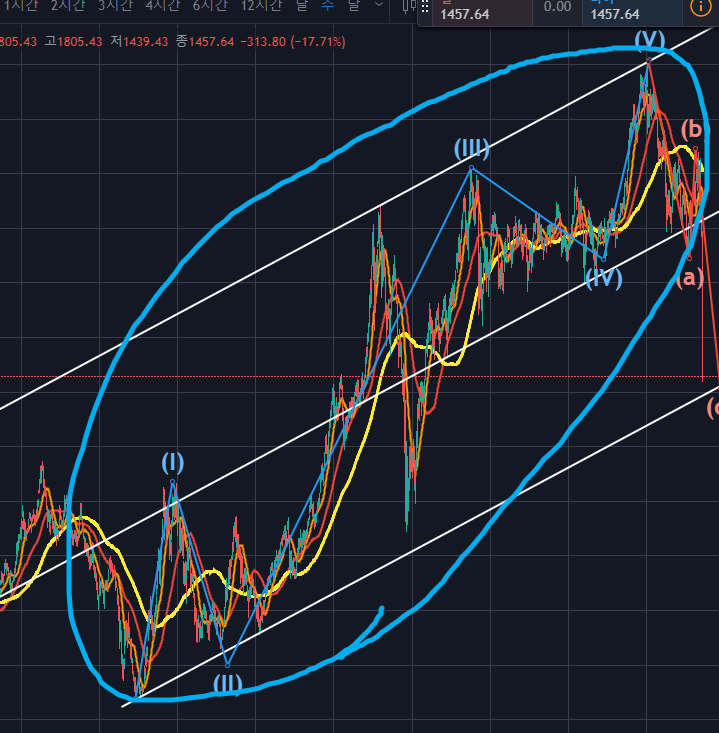아마 전의 고점부근까지 오르기에 다들 역대급 저점이었다며, 그리고 저점에서 잘 샀다며 좋아할 때 C파 강력한 하락을 할 것 같습니다.