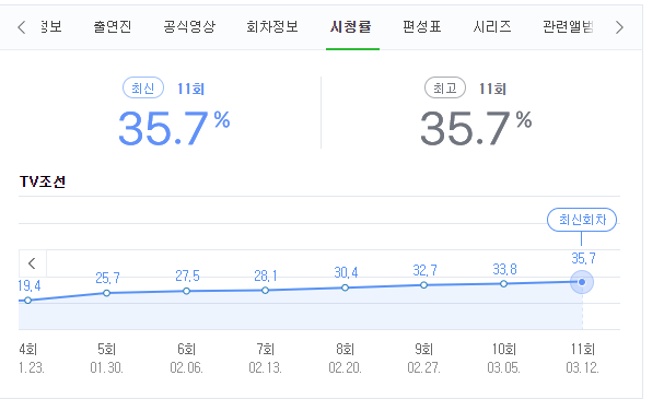 보게되면 떨어진 적 없이 매 회차 올라가는데요. 그만큼 한 번 본사람은 헤어나올 수 없고 주변사람들에게 전파한다는 것이지요.