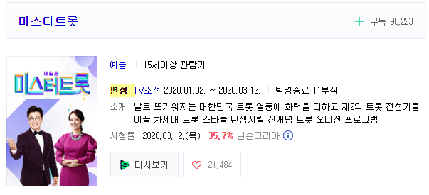 미스터트롯은 트롯 제2 전성기를 이끌 차세대 트롯 스타를 발굴하는 오디션 프로그램입니다. 그동안 발라드, 아이돌, 뮤지컬 등 다양하게 나왔는데 트로트 오디션은 처음이지 않을까 싶네요. 시청률은 3월 12일(목)요일 기준 무료 35.7%가 됩니다.