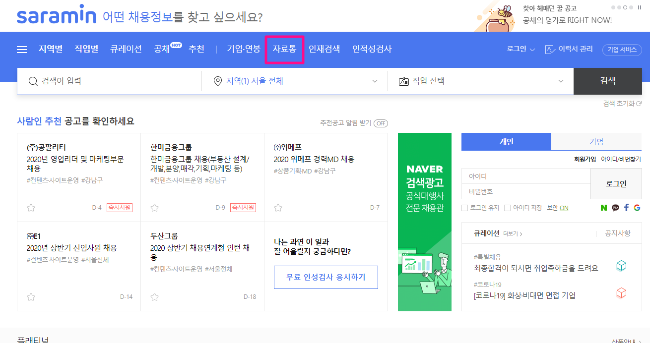 우선 사람인 사이트에 접속합니다.