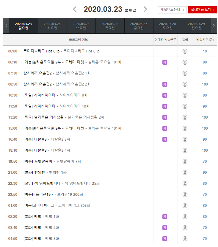 TVN 3월 23일(월) 편성표