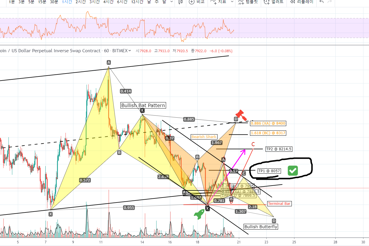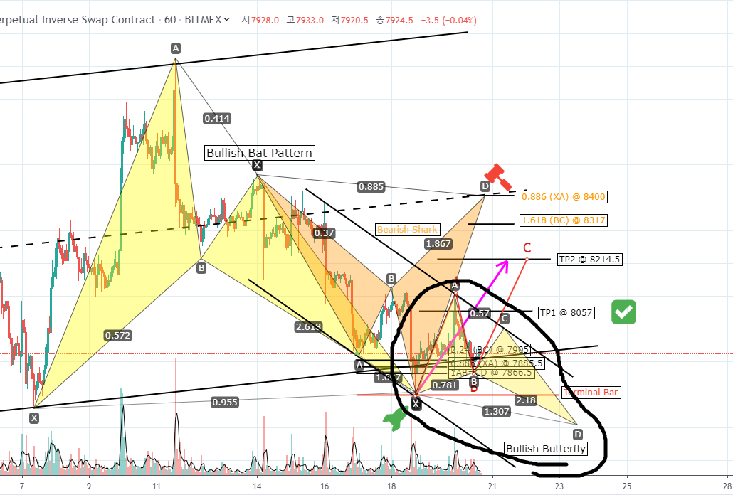 파란색 C 값은 매수 박쥐 패턴(Bullish Bat Pattern)의 TP2와, (매도 상어 패턴)Bearish Shark Pattern의 PRZ 부근과 유사하며, 검은색 abc가 나온 후 눌린다면 파란색 ABC가 피보나치 1:1 익스텐션 값으로 나와서 결국 8300~8400까지 상승을 보고 있습니다. 이 파란색 ABC까지가 메인시나리오입니다.