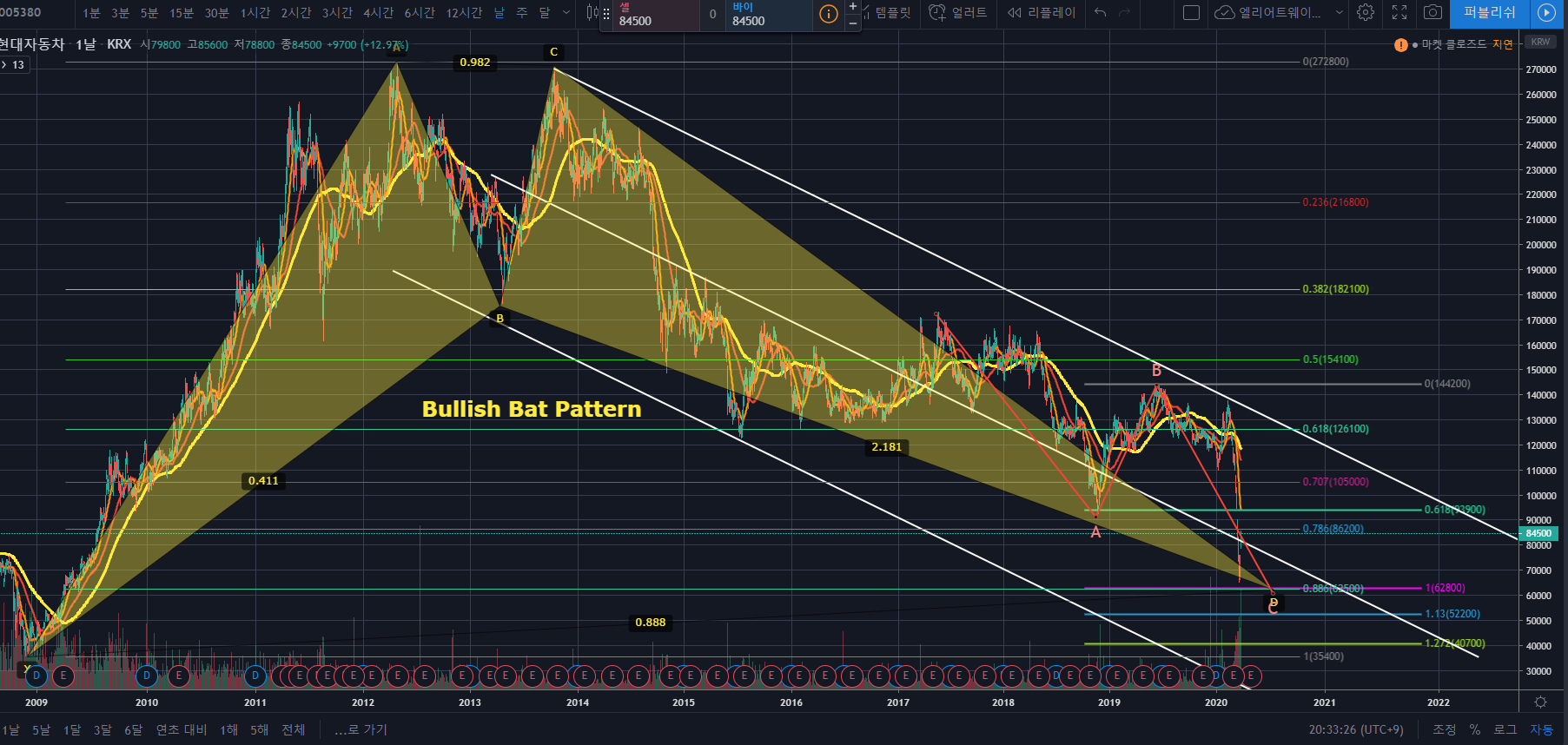 여기에서 저점을 갱신하며 Bullish Bat Patter의 PRZ를 테스트하고, 일봉상 일반 상승다이버전스 생성, 스토캐스틱 201212가 저점을 높이는 쌍바닥이 나오며 골든크로스로 상승한다면 폭발적인 상승이 나올 것 같습니다.