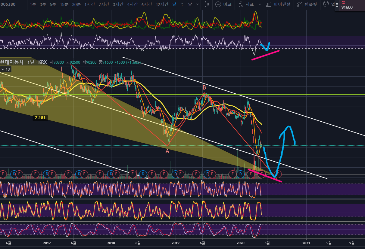 0.382 B포인트를 찍고 반등하였다가 2014년부터 계속하락을 해왔던 현대자동차는