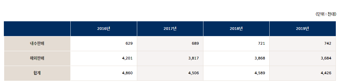 위의 도매판매 현황을 보면 알다싶이 현대자동차는 내수판매보다는 해외판매가 압도적으로 많습니다.