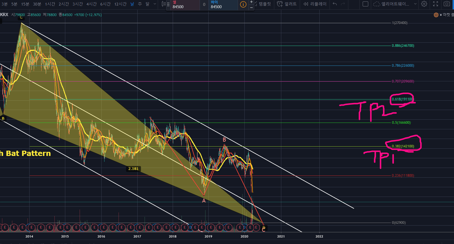 여기에서 저점을 갱신하며 Bullish Bat Patter의 PRZ를 테스트하고, 일봉상 일반 상승다이버전스 생성, 스토캐스틱 201212가 저점을 높이는 쌍바닥이 나오며 골든크로스로 상승한다면 폭발적인 상승이 나올 것 같습니다.