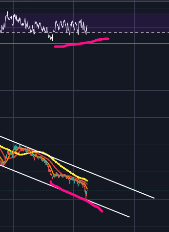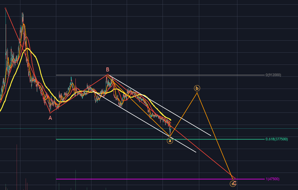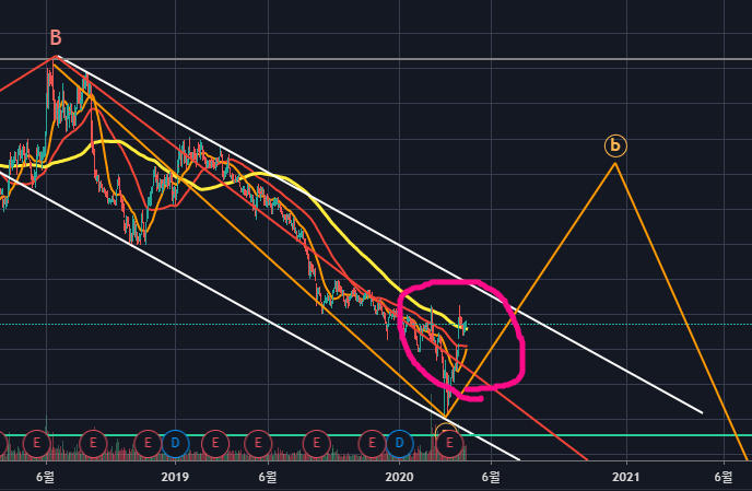 그렇기에 목표가격은 주황색 B파 반등으로 보고, 저 정도에서 하락시그널이 나오면