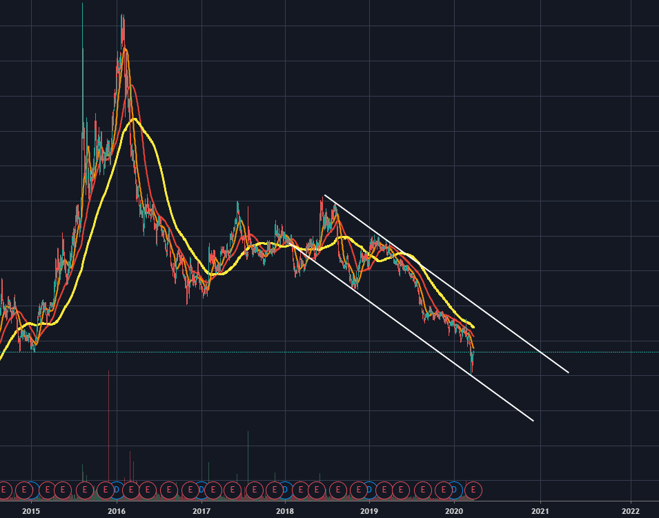 하락하는 주가는 하락채널링의 하단을 맞고 지지받고 있는데요.
