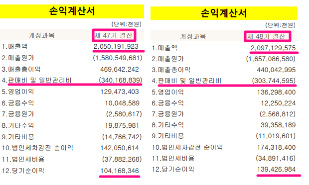 손익계산서를 보면, 매출액은 얼마 증가하지 않았지만 당기순이익이 큰 폭으로 증가한 것을 볼 수 있습니다.