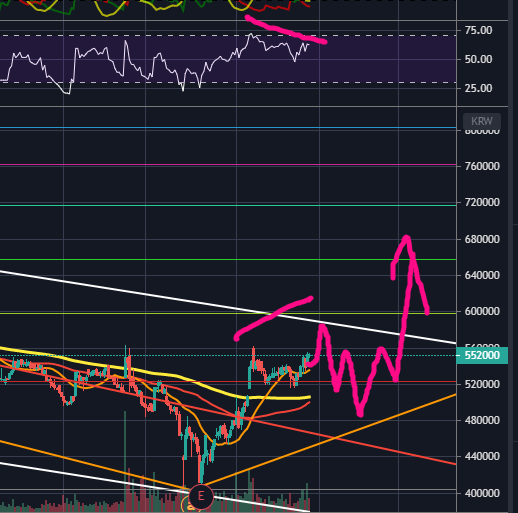 50-51만원대 매수하기 좋은 자리였는데, 51만원대가 온 후 상승하였습니다. 51만원대 진입하였다면 10%정도 수익인 상태겠네요.
