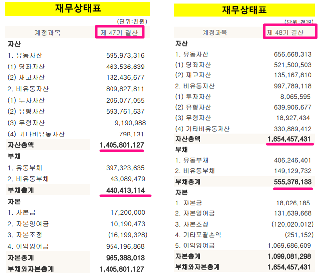 위의 재무상태표를 보면, 48기 결산(19(19년 3월 22일)자산에서 부채비율이 33%나 됩니다.