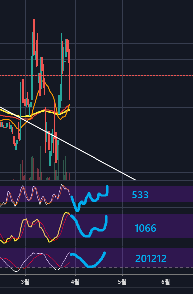 533과 1066이 데드크로스 후 하락을 시작하였으며, 201212도 고점 느낌이 나고 있습니다.