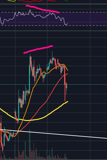 위의 차트대로, 일반하락다이버전스 후 약하락, 약반등 후 피보나치 되돌림 0.5까지 하락하며,