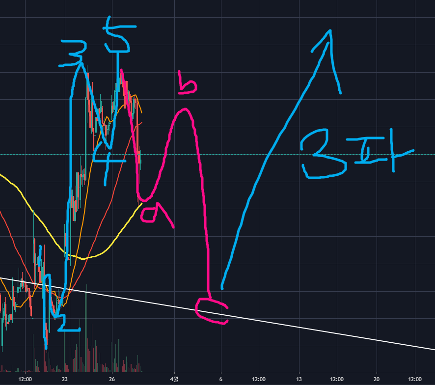 최근 파란색 5파 상승 후, 빨간색 A파 하락을 하였고 B파 반등이 진행 중으로 보입니다.