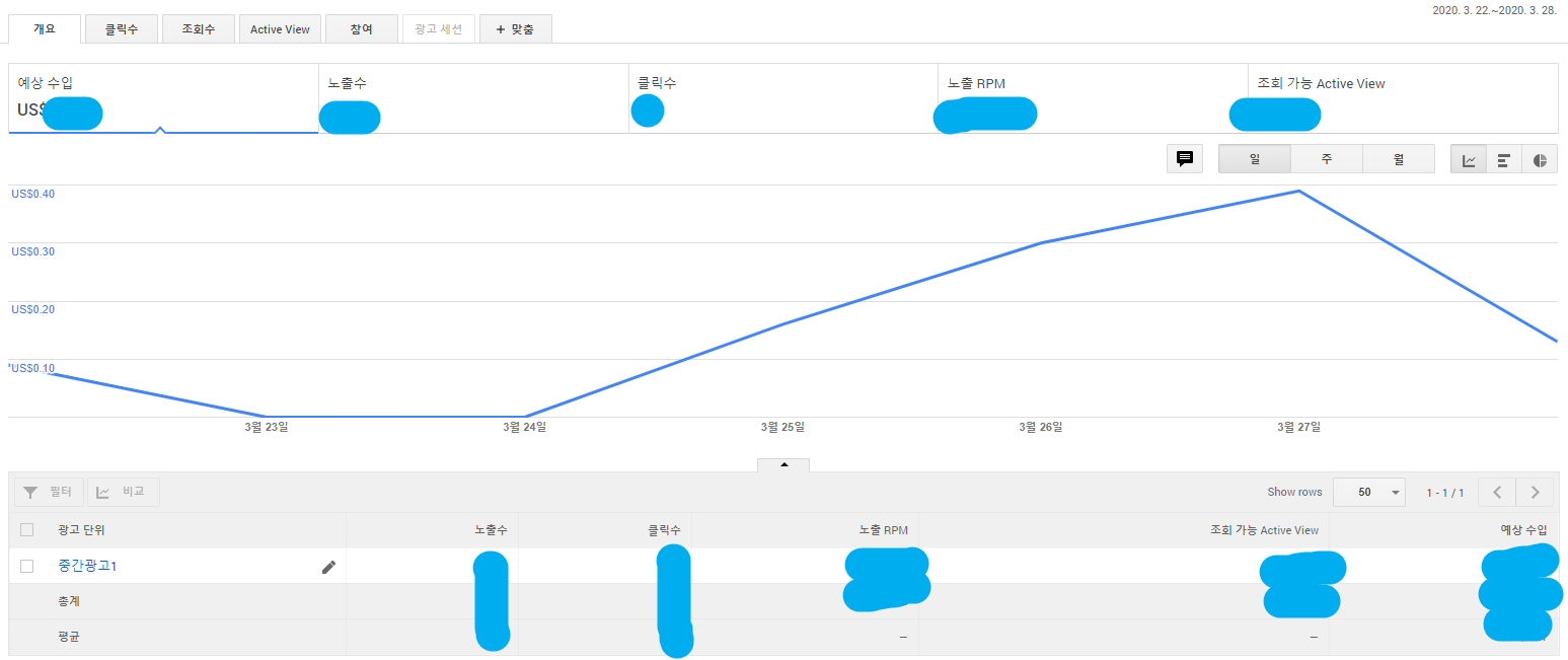 하단광고 1의 보고서를 보시면, 노출수/클릭수/노출RPM/예상 수입 등이 자세히 나옵니다.