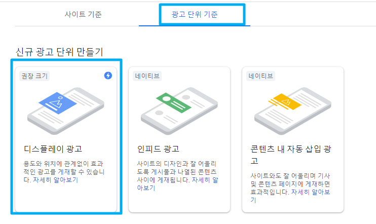그러면 사이트 기준과 광고 단위 기준이 나오는데, 우측에 있는 광고 단위 기준을 누른 후 아래에 디스플레이 광고를 눌러줍니다. 초보의 경우 디스플레이 광고만 사용하는 것이 좋다고하네요.